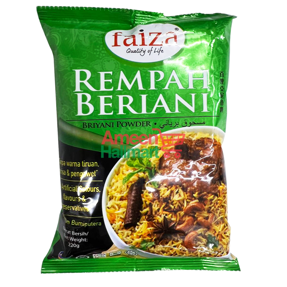 Rempah Briyani Faiza sesuai untuk masakan beriani biasa, beriani gam, beriani tanam dan pelbagai jenis beriani. Rempah ini juga boleh dibuat campuran bubur nasi, kebab, inti karipap dan murtabak.